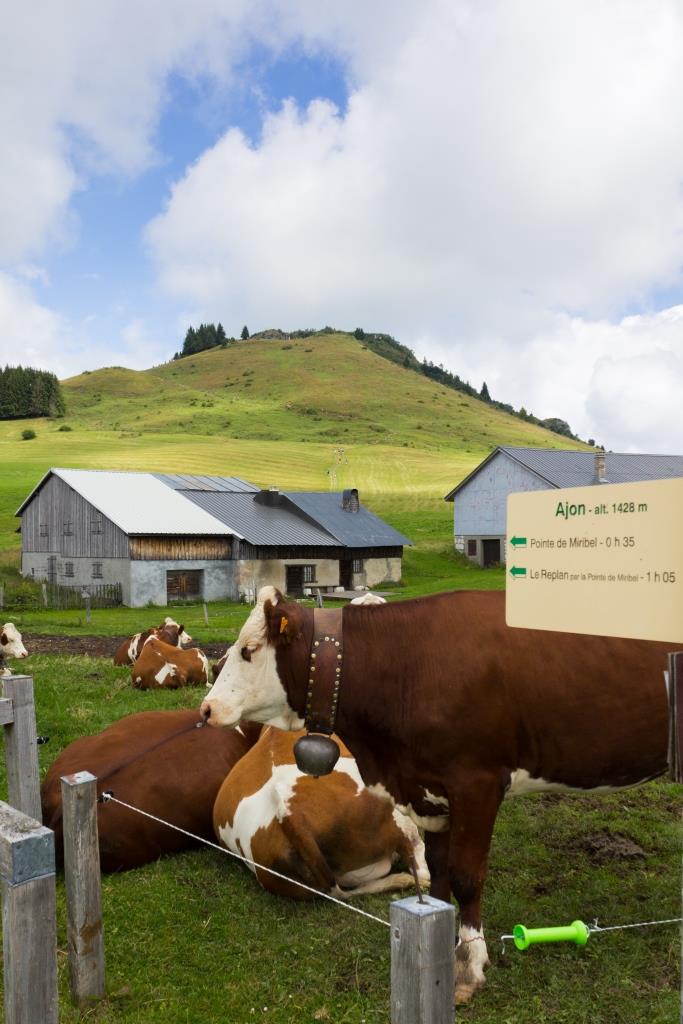 A la fin du pâturage, nous arrivons au lieu-dit « Sur la Tonne » (1304m). Le sentier est toujours large et continue en montant en pente douce. Arrivés sur un court plat, un sentier descend à droite pour rejoindre un chalet. Nous ne l’empruntons pas et partons sur la gauche. En étant attentifs, nous trouvons d’ailleurs un petit panneau avec une flèche jaune sur fond vert accroché à un poteau qui indique cette direction. Nous rejoignons très vite un nouveau chalet que nous contournons par la gauche. Après une courte montée, nous sortons du pré pour rejoindre un chemin blanc. Celui-ci débouche assez vite sur un chemin blanc plus large. Nous allons à gauche en direction des chalets d’Ajon. Arrivés à Ajon (1428m), nous partons à droite, comme nous l’indique le panneau, pour monter à la Pointe de Miribel (35 minutes jusqu’au sommet sont annoncées).